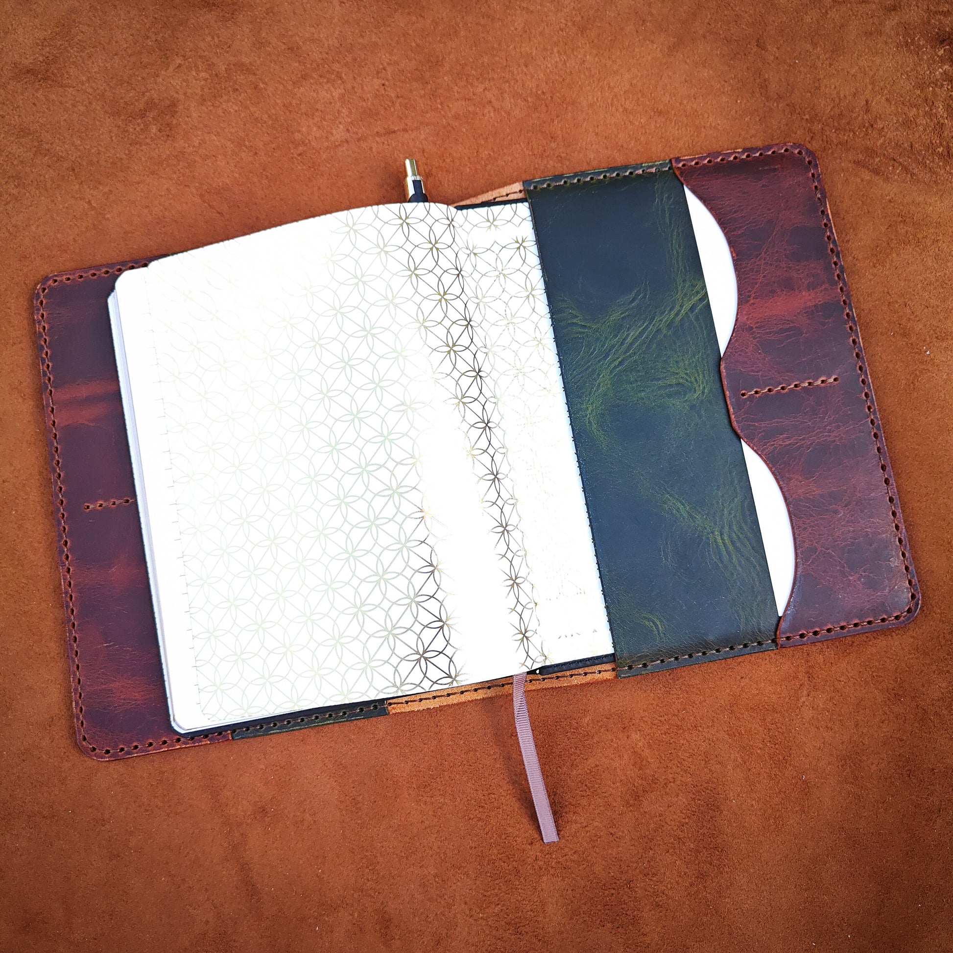 Nahkakannet ovat valmistettu Italialaisesta Carlo Badalassi Öljynahasta.